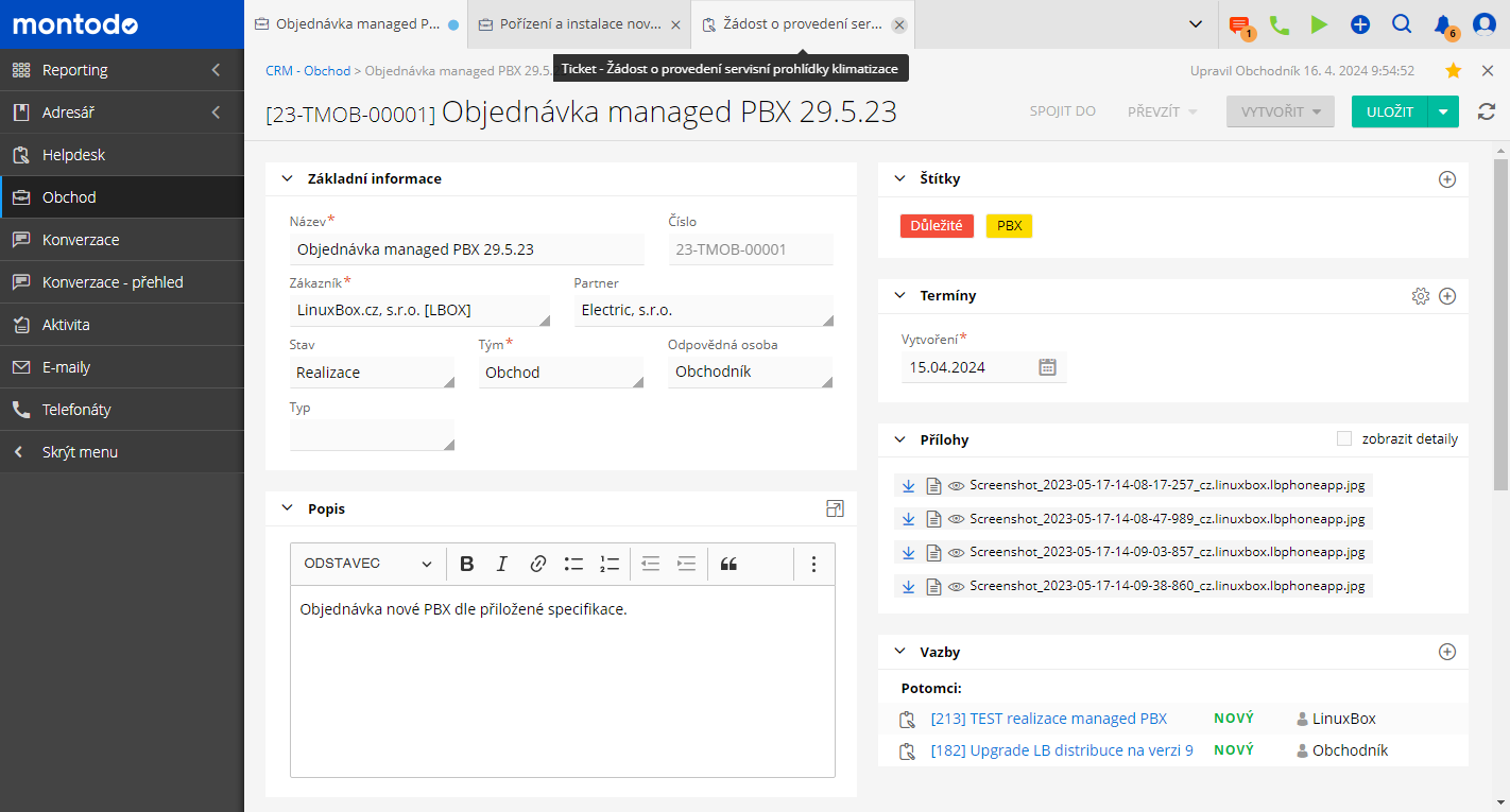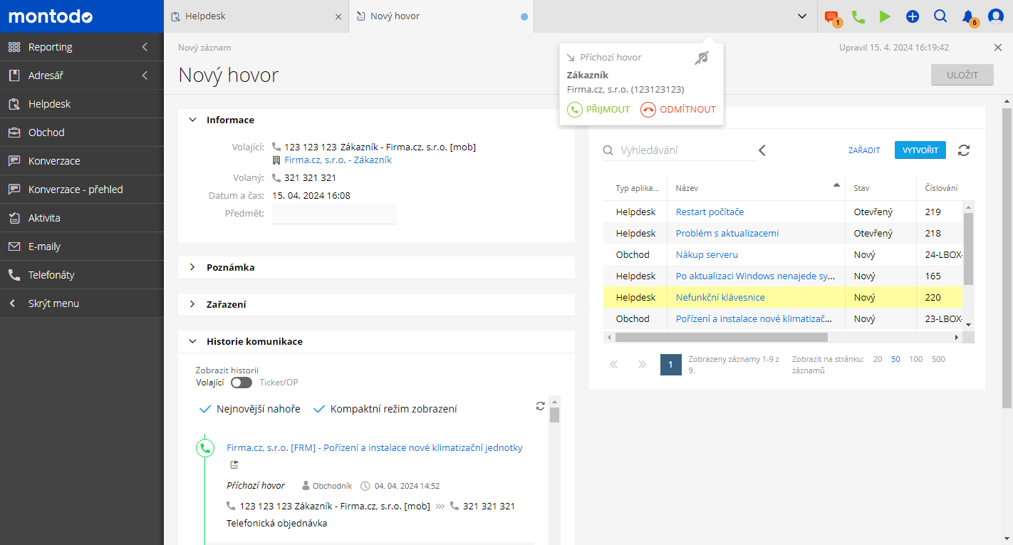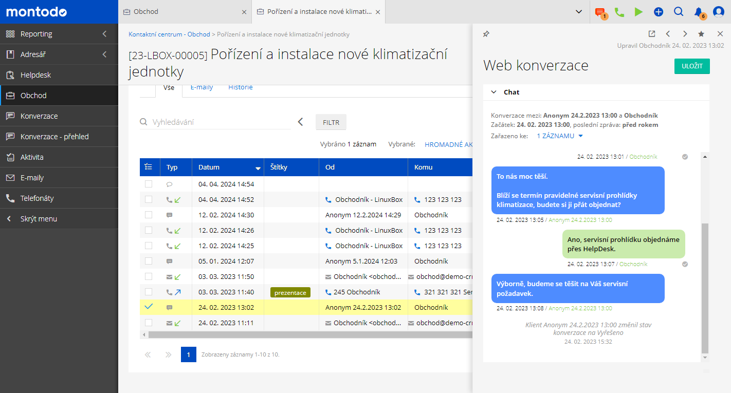 Klíčovou výhodou Montodo je bezproblémová integrace s modulem Požadavky. Každá komunikace, ať už jde o telefonní hovor, chat, e-mail nebo SMS, je automaticky propojena s příslušným požadavkem. Výsledkem je kompletní historie interakcí, která zahrnuje: