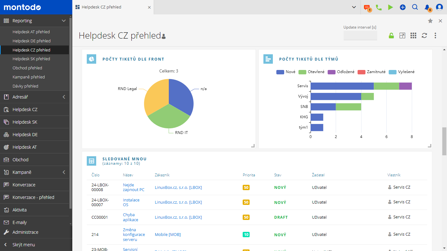 • Reporting: vestavěné reporty poskytují informace o počtu otevřených a uzavřených požadavků, průměrné době řešení či spokojenosti zákazníků.